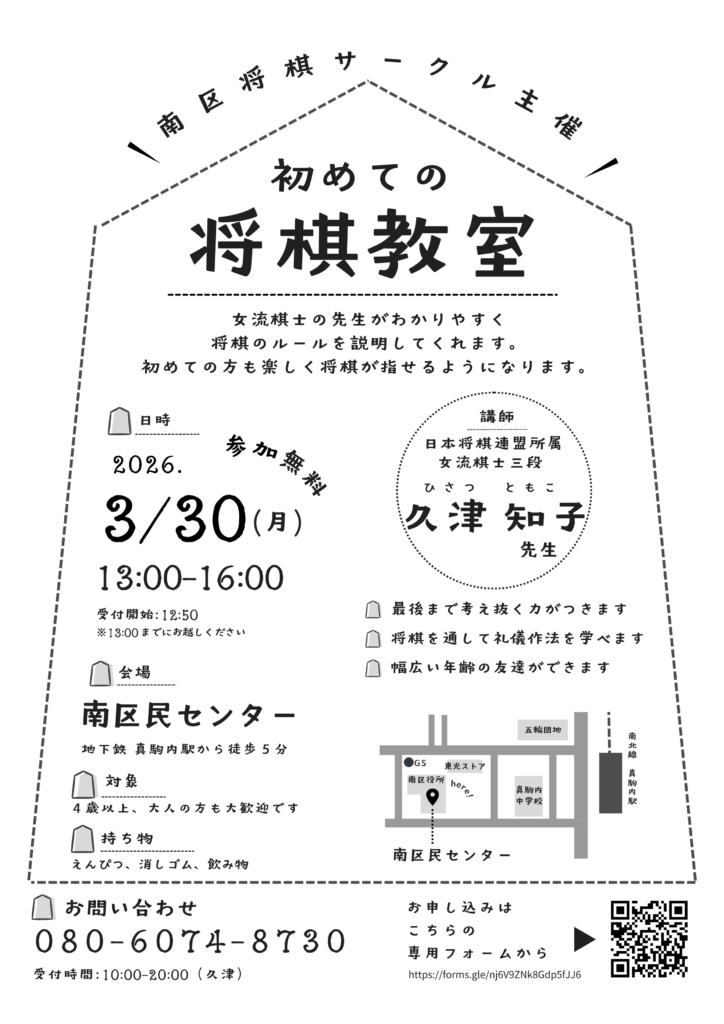 南区将棋サークル主催!南区民センターにて「初めての将棋教室」が2026年3月30日に開催されます!